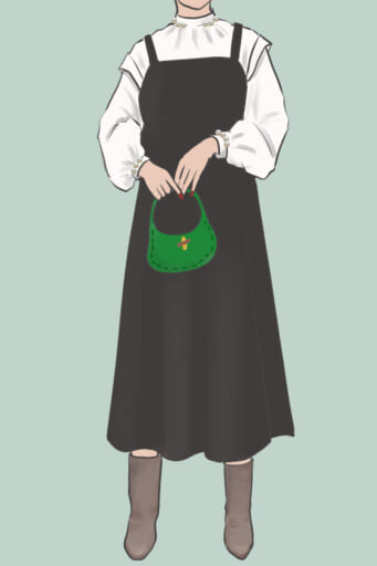 なお、小物はベロアやレザーなど少し重たい印象のアイテムを選ぶと、秋っぽい雰囲気に。また、ブーツはショート丈を選んでスカートとブーツの間の素肌を見せて抜けを作るのがバランスよく着こなすポイントです。