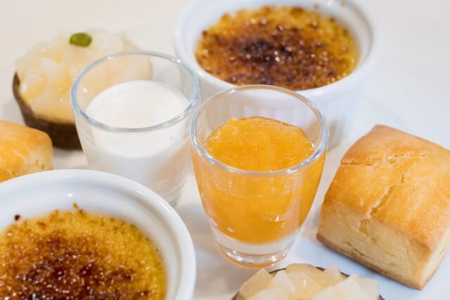 洋梨「ル レクチエ」のタルトや、南魚沼産コシヒカリの中でも特に評価の高い「庄治郎米」を使ったライスブリュレ、佐渡のジャムや地元産の甘酒クリームでいただくスコーンなど、ご当地食材が楽しめるスイーツが並びます。