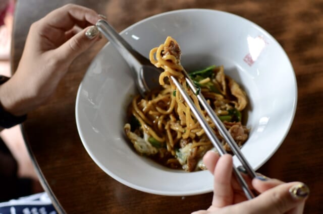 町に到着して最初に向かったのは「ミートンポー」というお店。街並みを見るだけでも海外からの文化が入ってきていることがわかるプーケットタウンですが、もちろん食文化も例外ではありません。その中でも中国福建省の福建麺を使った料理は、現在では街を代表する名物グルメとなっています。ミートンポーはそんな福建麺を70年以上も前から提供している老舗のローカルレストランで、「ミシュランガイドプーケット2020」で選ばれたほどの実績を持ちます。