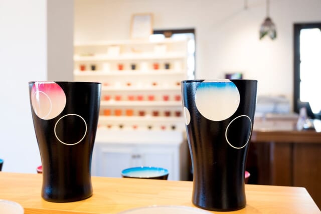 ガラスに漆を塗るのはとても困難ですが、独自の技法で会津塗を施したガラス食器などを販売する人気のお店。直営店のため値段もお手頃で、カラフルでモダンな商品をそろえます。写真は高品質な漆を使った会津塗のカラーグラデーションシリーズのカップです。
