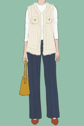 プリーツ素材の「プリーツワイドカットオフパンツ」はシンプルすぎず、どんなトップスも活かしてくれる優秀パンツ。今シーズン注目のツイード素材のベストを合わせても、おしゃれにまとまります。