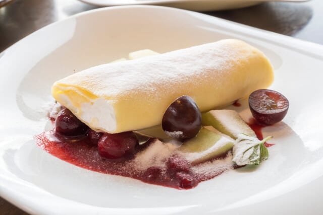 季節のフルーツやクリームなどをのせた月替わりのクレープもイチ押しです。2023年11月は開業18周年記念の特別メニューで、「ミックスベリーとぶどう、メロンのクレープ」でした。たっぷりのホイップクリームに、フルーツやベリーのソースが加わって、贅沢な気分を味わえました。