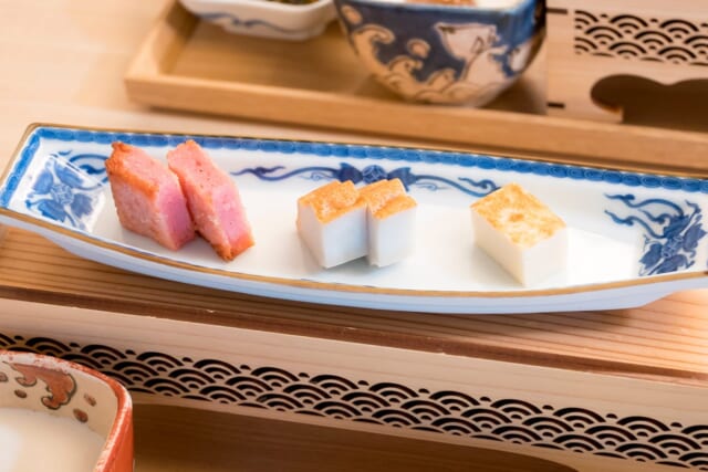船形の器にのった練り物は、左から「赤天」、トビウオのすり身で作る松江名物「あご野焼き」、「厚焼き」。特に「赤天」は島根県浜田市のソウルフードで、魚のすり身に赤唐辛子を練り込んで、ピリ辛に仕上げます。
