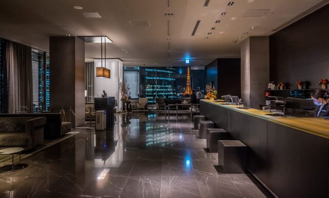 ガラス張りのロビーからは、東京タワーや高層ビル群を望めます。