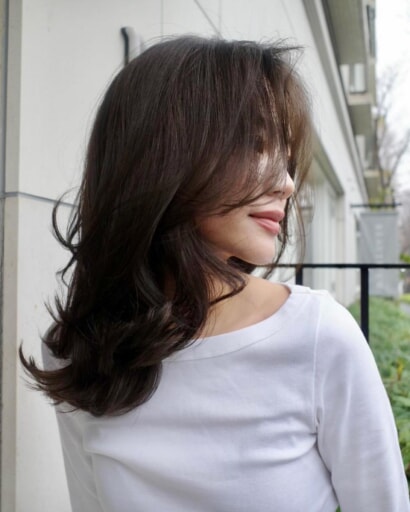 顔周りの髪にレイヤーを入れると髪に自然な動きが出てこなれ感抜群。フェイスラインをさりげなくカバーできるので若見えにつながりますし、今っぽい雰囲気を思い切り醸せます。