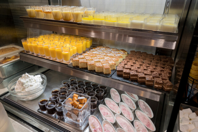 レモンパンナコッタやカスタードプリンなどミニカップのケーキのほか、マンゴープリン、チョコケーキなどの冷製デザート、アップルクランブルやブレットバタープディングなどホットデザートまで種類豊富。ソフトクリームマシーンはバニラ、チョコ、ミックスと3種類の味が用意され、フルーツなどともアレンジ自由です。