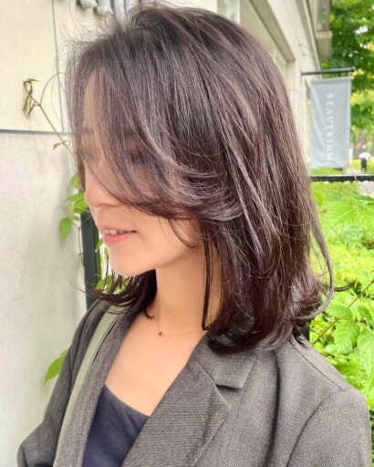 髪の中間から毛先にかけてレイヤーを入れるのが基本で、スタイリング時にレイヤーカットをした部分の毛先にほつれ感や揺れ感をほんのり演出すれば、一気にこなれた雰囲気に。また、顔周りの重心を低めにして、あご周りをほっそりとした印象に見せるのも若見えの鍵です。