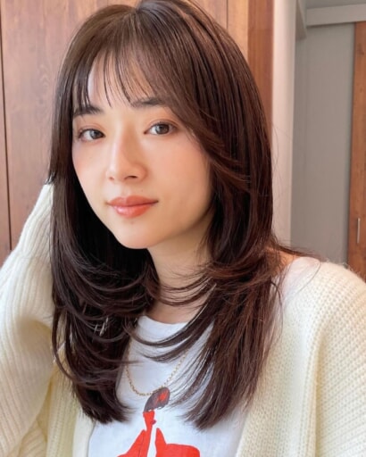 全体にレイヤーを入れてふんわりとした仕上げつつツヤ感を補うスタイリング剤で仕上げれば、グッと色っぽさが引き立つスタイルに。また、全体的に顔の下側から毛先にかけてコテで巻いたり、ハネ感を出したりなど、ちょっとした動きをプラスするとAラインが生まれ、小顔感もグッと引き上がるでしょう。