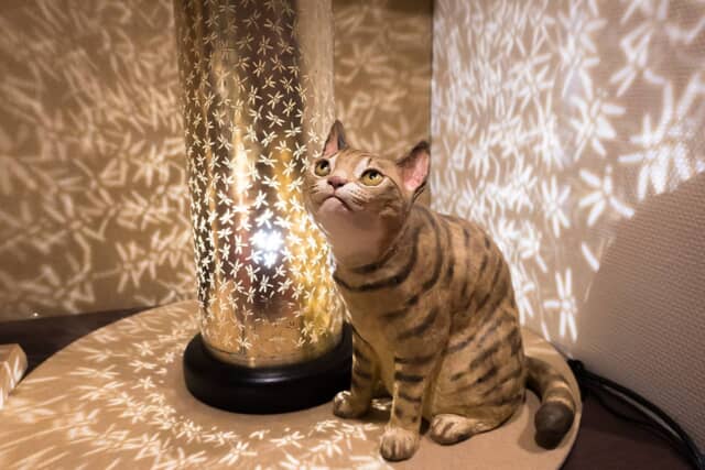浴衣を染めるため伊勢型紙の台紙を真鍮板にエッチングして、円筒の照明器具にした埼玉県越谷市にある中野形染工場。無数に飛び交うトンボの影絵を周囲に投げかけ、柏木技術鋳物研究所が作った小田原風鈴の音色が辺りに響きます。造形作家小澤康磨氏の手による置物の猫は、まるで何かを伝えようとするような眼差しを向けていました。