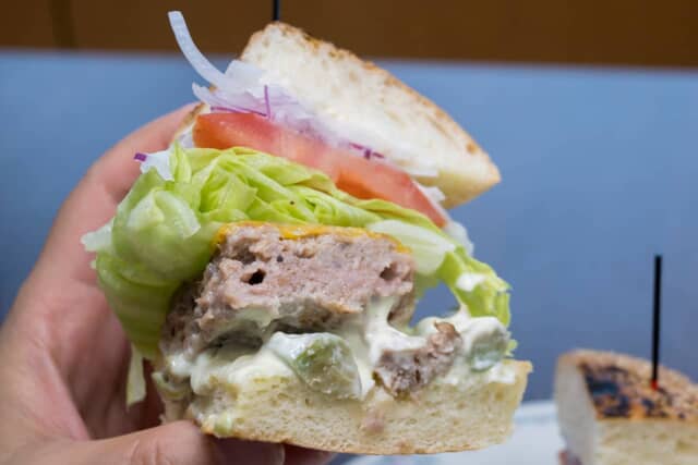 夏のビーチにピッタリの「かもめバーガー」は、黒毛和牛と黒豚をミックスしたパテをはじめ、レタスやトマト、オニオンスライスがサンドされ、アボカドマヨネーズで味付け。満足感のある一品です。