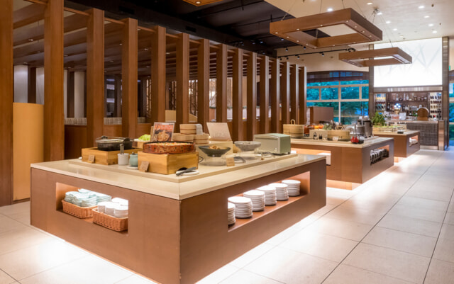 朝夕の食事は「メインダイニング樹林ガーデン」でいただきます。ディナービュッフェは朝採りの地元野菜を使った料理や、日替り握り鮨、人気メニューの上州牛の牛丼やホテル特製スパイスカレーなど約50が種並びます。