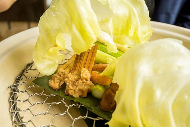 朝のメイン料理は食材にフタをして蒸し上げる「焙烙蒸し(ほうろくむし)」。アスパラガスや人参が、ドーム状になったレタスの下に隠れていて、湯気になって立ち昇る野菜の香りで優しい気分になりました。畑から野菜を収穫するように、手でつまみ上げて食べるのがおすすめ。塩をつけてさっぱりいただいたり、香ばしい焼き味噌をつけたりと、濃い野菜の味を引き立ててくれました。