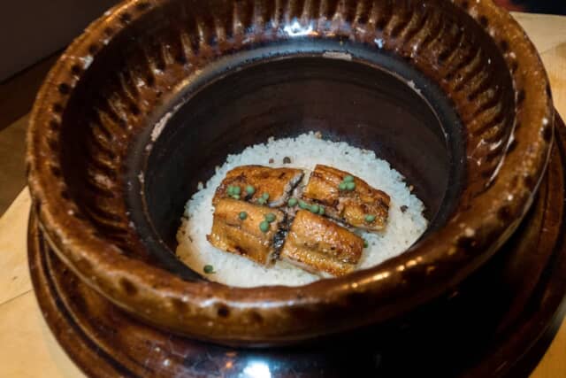 ▲土鍋で運ばれる「むなぎ(ウナギ)」のひつまぶし