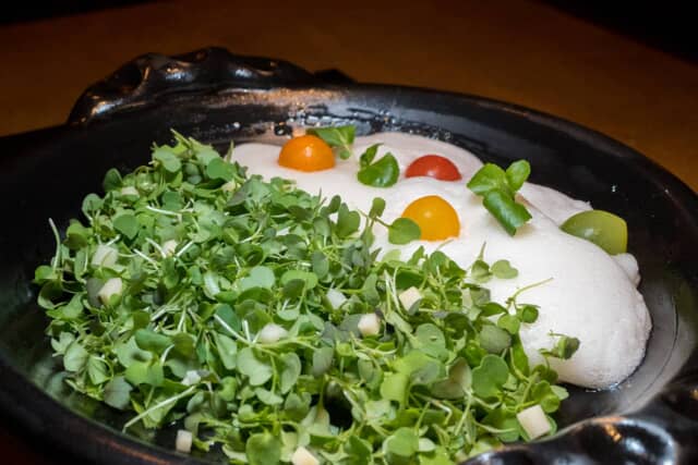 驚きの料理は「勧進帳 山渓」と名付けられた “変わり鍋” でいただくしゃぶしゃぶです。長野の夏をイメージした鍋は、緑豊かなマイクロハーブの山々と、出汁を泡立てた夏雲です。野菜もたっぷりくわわり、洋風な味付けの出汁の味がとても美味しかったです。