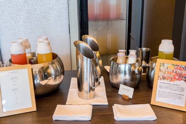 ドリンクコーナーには、生絞りのオレンジやグレープフルーツジュースのほか、栄養たっぷりのコールドプレスジュースも並びます。