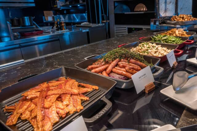 クリスピーベーコンやマッシュルームのソテーなど、洋食メニューも充実。ハーブソーセージはとってもジューシーでした。