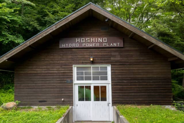 川の水を利用した水力発電や、浴場の湯船からあふれた温泉の熱を再利用するなど、星のや軽井沢全体で使用するエネルギーの70パーセントほどを、自然由来のエネルギーで賄っています。