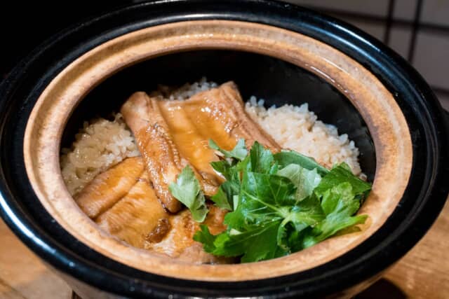 〆は土鍋の炊き立てのご飯が運ばれます。この日は穴子飯でおこげも香ばしく、お腹いっぱいになりました。