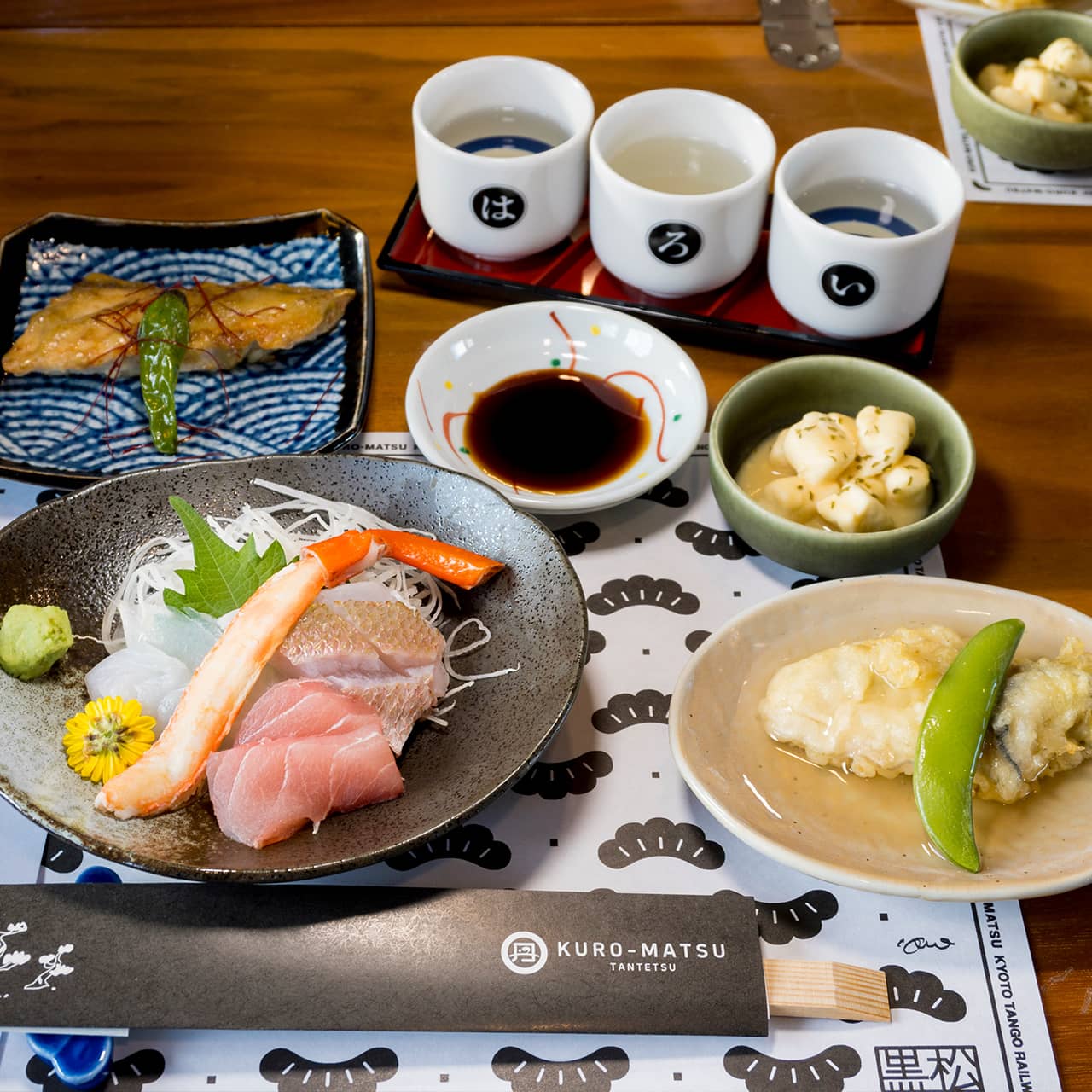 レストラン列車【丹後くろまつ号】の車窓から、京丹後の海を見ながら地元の魚料理と地酒のペアリングを楽しむの「地肴コース」。秋・冬のコースは2024年10月から2025年3月までの金、土、日、祝に運行していて、「モーニングコース」「ランチコース」「地肴コース」の1日3便を運行。今回は風光明媚な日本海の風景と共に地酒を楽しむ「地肴コース」を紹介します。