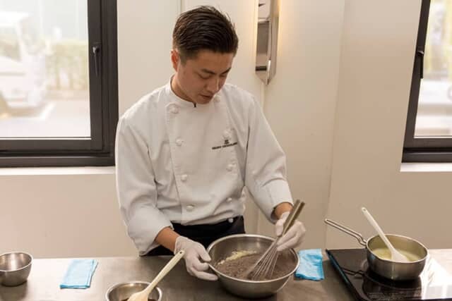 試食会ではバレンタインシーズンに販売される「フィナンシェ・オ・ショコラ」の製造を特別に公開。生地には、北海道産のオリジナル発酵バターをはじめ、卵白や塩、バニラの香りがついた砂糖を入れて、コクの深いフィナンシェに仕上げました。