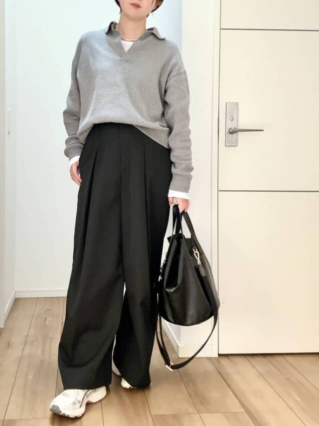 スタイリングにアクセントをプラスしてくれる襟とスキッパーがスッキリとしたシルエットに見せてくれるので、計算せずとも女らしさを醸せるのが1番の魅力。スウェットとニットのいいとこどりをしたようなやわらかな着心地かつ綿100%なので毛玉にならないのも嬉しいポイントです。1枚ではもちろん、レイヤードした着こなしも愉しめて、幅広い着回しができます。