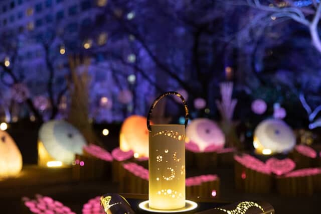 桜の花びらをイメージした竹あかりが様々な色に優しく光ります。数量限定ですが “竹あかり提灯” のレンタルもあって、センサーのある台に置くと、特別な音楽と光の演出を楽しめます。