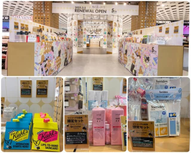 店内に一歩足を踏み入れると、両サイドにリニューアル記念の限定セットがずらりと並んでいます。トレンドブランドから注目の韓国コスメまで、幅広いセレクションが2025年3月11日まで特別価格で購入可能です。
