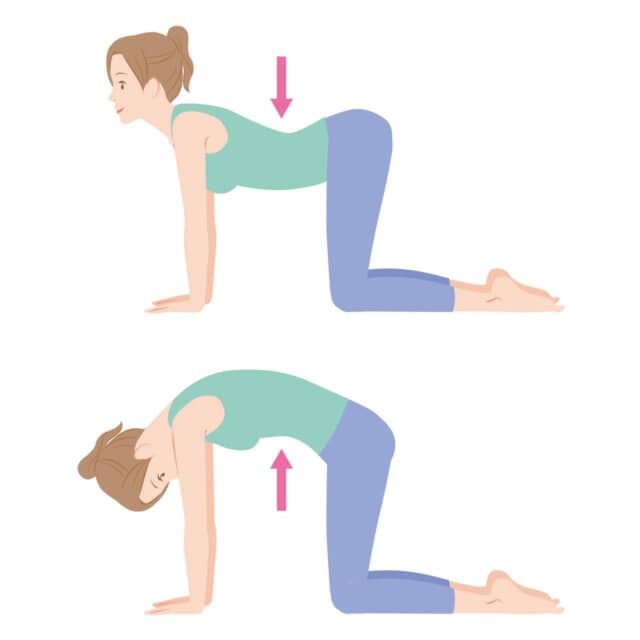 ▲ヨガの「キャット&カウ」…四つん這いで背中を丸め(キャット)、反らせる(カウ)動きを繰り返すだけと、とても簡単!