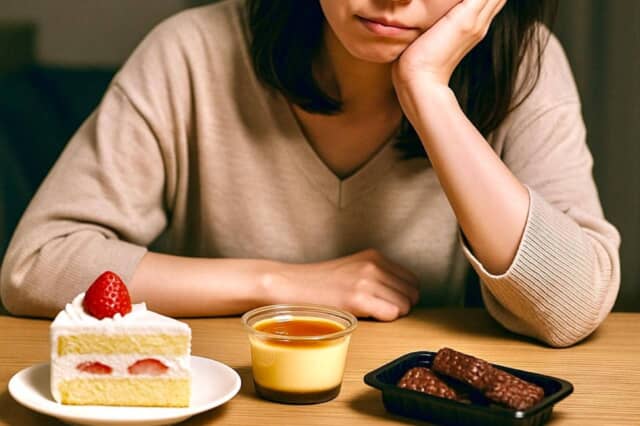 コンビニのスイーツは1つあたり300〜500kcalと高カロリー。しかも夜に食べると消費されにくく、そのまま脂肪として蓄積されやすいのです。さらに夜は、食欲を増進するホルモン「グレリン」が活性化するため、甘いものの誘惑に負けやすい時間帯でもあります。