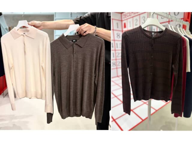 まず注目したいのが、1枚でサマ見えする「メリノポロセーター」と「メリノリブクルーネックショートカーディガン」(各¥3,990)。極細のメリノウール100%を使用し、なめらかな肌ざわりと上品な光沢感が魅力です。