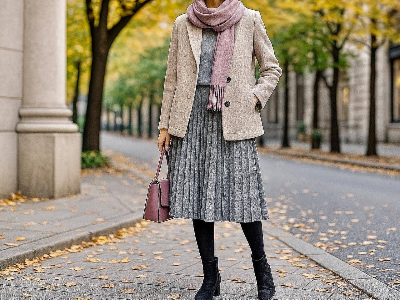 例えば、ベージュやグレーのアウター、モーブピンクのバッグを差し色にするだけで、全体の印象がグッと軽くなります。黒タイツは肌を覆う面積が大きいぶん、“重たさ”が出やすいアイテム。だからこそ、トーンをそろえるより“抜けをつくる”意識が若見えのポイントです。