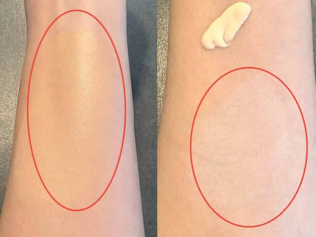 ▲左:赤丸はファンデーションを伸ばした仕上がり、右:赤丸は下地を伸ばした仕上がり