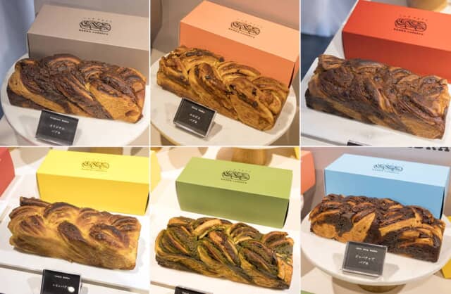 上段左からチョコレート生地をたっぷり練り込んだ「オリジナルバブカ」をはじめ、「エルビスバブカ」「アップルシナモンバブカ」「レモンバブカ」「抹茶あずきバブカ」「ジャバチップバブカ」の6種類をそろえます。パッケージもカラフルで可愛らしく、手土産にもおすすめです。