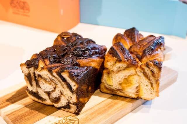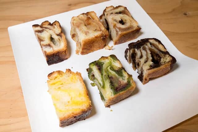 バブカにはそれぞれフレーバーがたっぷり練り込まれ、重さもズッシリ。生地は独自の製法で丁寧に編み込まれ、カットした断面が美しい模様を描いているのも特徴です。そのまま食べるもよし。焼くと外はサクッと、中はしっとりして、より風味が際立ちます。さらに冷蔵庫で冷やしても、層がギュッと凝縮して濃厚な味わいに。