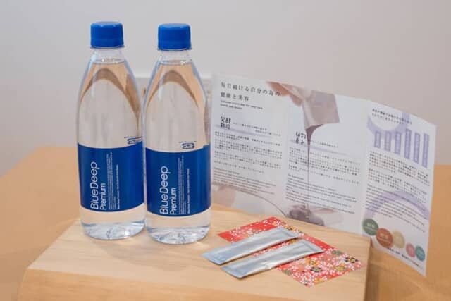ヤマブドウや野草などを使った発酵食のペーストはベリー系のフルーティーな味。シリカ成分を多く含んだミネラルウォーター「ブルー スプリング プレミアム」は、のぼせ防止に3分の1ほどを目安に飲みました。