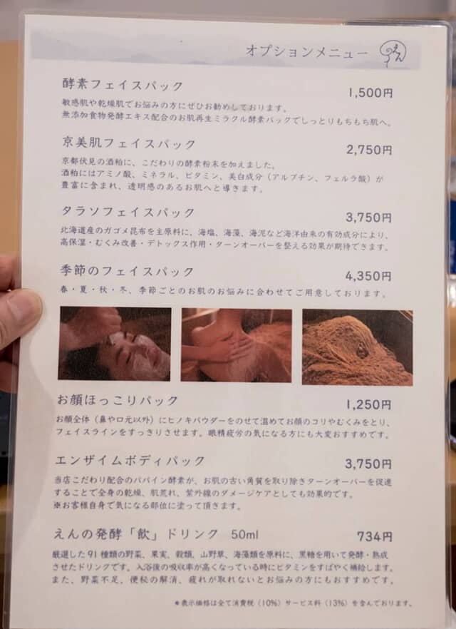木浴の最中に、数種類用意されているオプションのフェイスパックを体験できるほか、顔全体をヒノキパウダーで覆う「お顔ほっこりパック」などがありました。