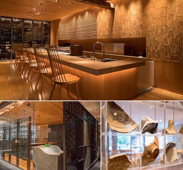 背後の壁面に竹を飾った美しい寿司カウンターもありました(現在休止中)。半個室は飾り棚や格子で仕切られ、古い陶器の破片やレトロな錠前など、歴史を感じる遺物がテーマごとに飾られています。