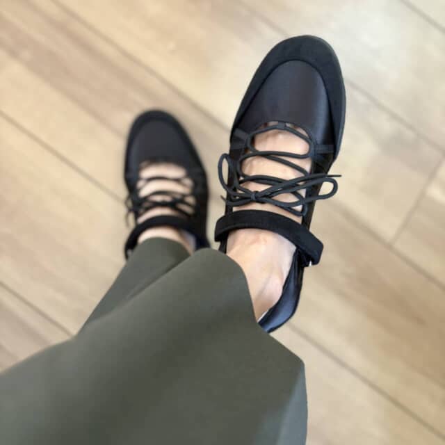 サテン素材があしらわれた上品なルックスに加え、ストラップやレースアップ仕様でフィット感も抜群。カラーはブラック、ブラウン、シルバーグレーの3色展開で、まとめ買いする人が出るほど人気を集めています。足元を華やかに更新したい人にぴったりの一足です。