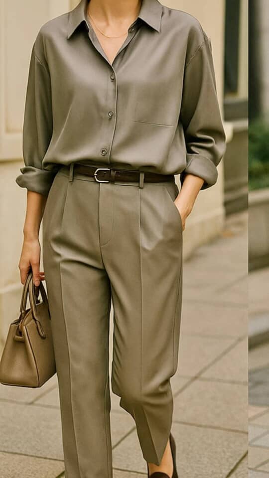 上品なグレージュのとろみシャツは、秋のオフィスシーンにぴったり。ゆるやかな落ち感と光沢感が、シンプルな装いに華やかさを添えてくれます。タック入りのパンツと合わせれば、「きちんと感」と「抜け感」の絶妙なバランスに。