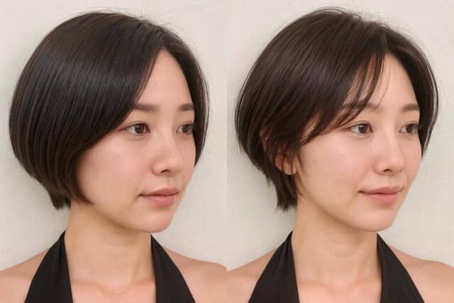丸みのあるショートは優しい雰囲気を与える人気スタイルですが、重心が下がりすぎると古臭い印象に。特にトップにボリュームがなく、耳周りや後頭部にだけ丸みが集まっていると「昔の髪型」感が出てしまいます。
