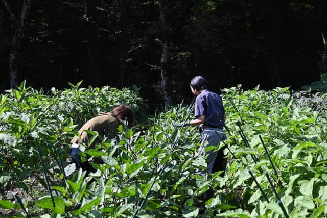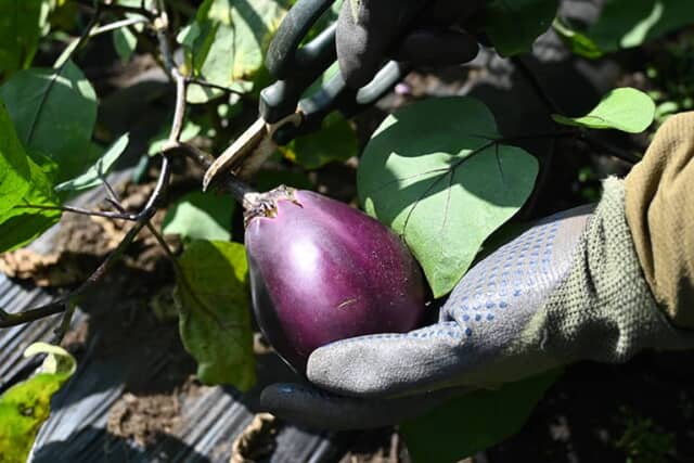 畑に入って大きく実った野菜を物色。生い茂った葉っぱをかき分け「これは小さい」「こっちは青い」。そして大きな茄子を発見!つい夢中になってしまう収穫です。スタッフも一緒に探してくれました。