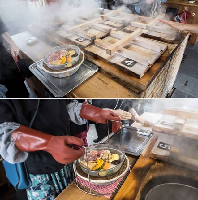 「海鮮セット」や「肉セット」など数種類の中からメニューの食材を選び、火傷をしないようにアームカバーや手袋をして地獄蒸し釜に入れます。15分ほど蒸したら出来上がり。