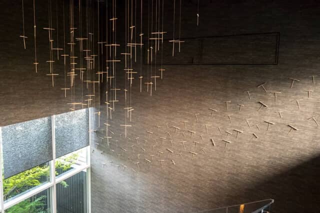 栽培竹林の生産地として日本一の大分県。様々な道具や工芸品に使われる竹細工が有名です。食事処の入口は開放感のある吹き抜けになっていて、壁に80個もの竹とんぼが飾られるほか、シャンデリアのように宙を彩る竹とんぼがキラキラと浮かびます。