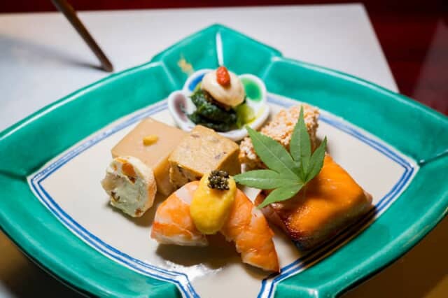 豊かに香るお吸い物には、鶉(うずら)肉のすり身を使った珍しい真薯のうえに、紅葉麩と玉子柿を盛り付け、菊菜の緑が添えられます。優しいお出汁の味わいに秋を感じる一品でした。