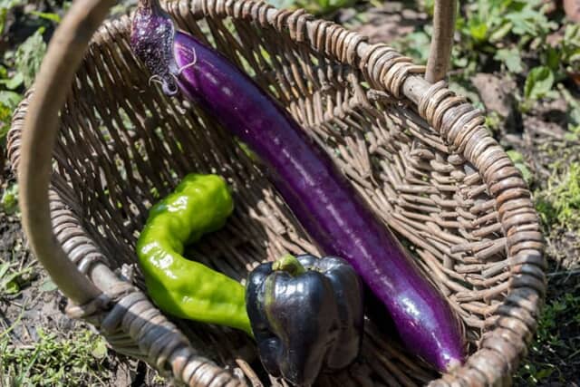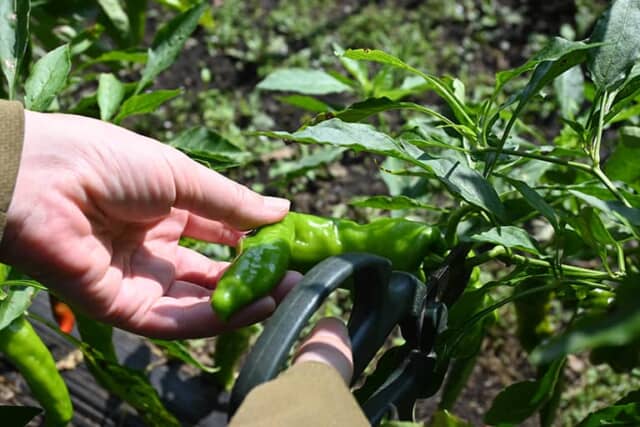 9月中旬のこの日は、京野菜の「万願寺とうがらし」や、初めて目にする黒いピーマン「浜クロピー」、30センチを越えるとても細長い茄子「ジャパニーズピクリング」を収穫。京都では何度も食べたことのある万願寺とうがらしは、熟しすぎると赤くなり甘くなることを教えてもらうなど、初めて聞くお話ばかりでした。