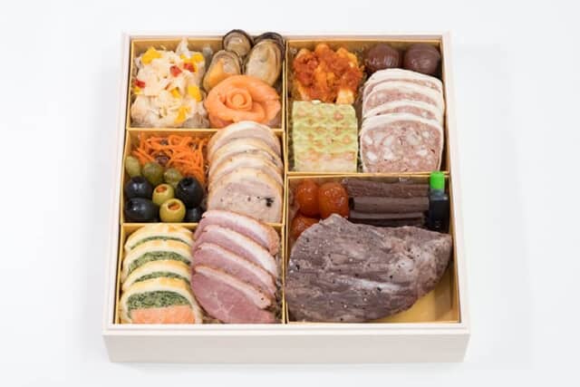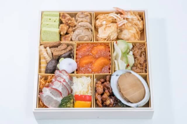 「壱の重」は、海老旨煮、数の子醤油漬け、銀鮭柚庵焼、黒むつ西京焼、鰊昆布巻、巻湯葉味付け、高野豆腐含め煮、小城麩、伊達巻、紅白花型餅、てまり餅など25品。