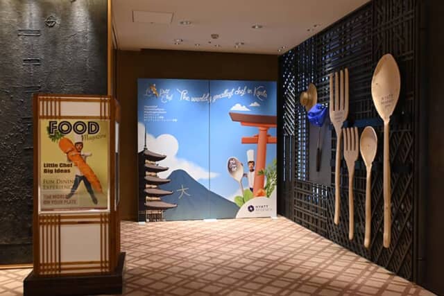 場所はハイアット リージェンシー 京都のガーデンフロア(地下1階)。プチシェフのために用意された特設レストランです。入口には巨大なスプーンやフォーク、刀なども用意され、それらを持って記念撮影もできます。