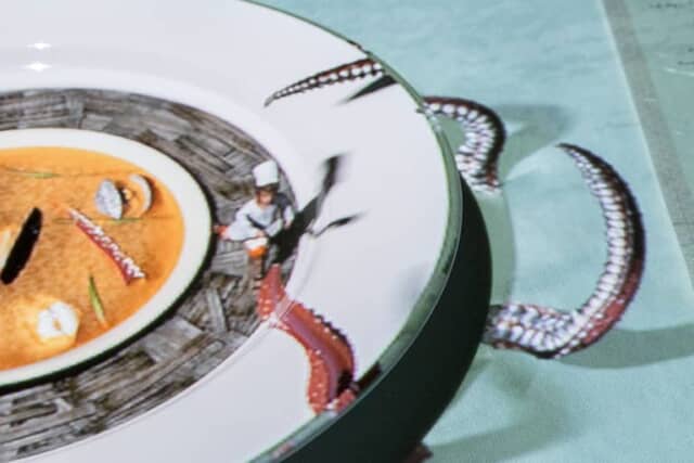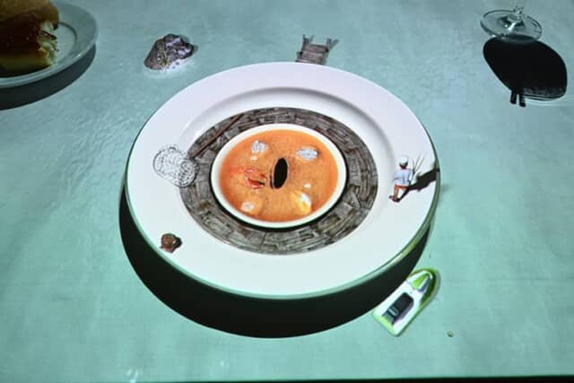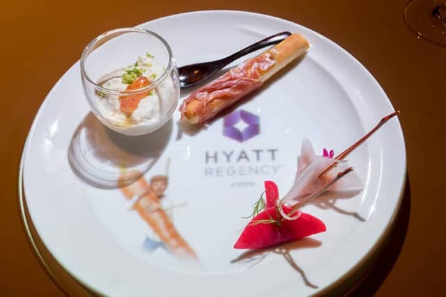 ここでは5種類のコースのうち「マスターシェフ」を紹介します。テーブルに置かれた真っ白なお皿には、ホテルのロゴと巨大な人参…ではなく、普通サイズの人参を抱えた小さなプチシェフが映し出され、まるでシェフの紹介画像を思わせます。初めに30分ほどアミューズとドリンクを楽しみながら、これから何が起こるのか期待がふくらむひと時です。