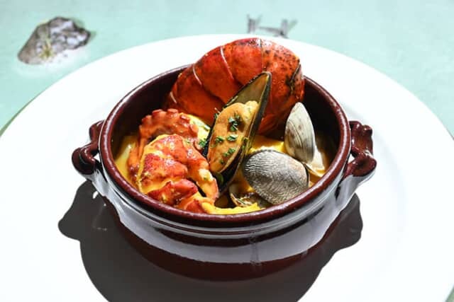 そして周囲が海に囲まれたお皿に、本物の「ブイヤベース~ロブスター 真鯛 ムール貝 浅利 真蛸 フェンネルのソテー ルイユを添えて」が運ばれます。スープは魚介の旨味たっぷりで、ロブスターは大きく身もプリプリ。タコもとっても柔らか。別添えの少し辛みのあるルイユソースも絶品で、途中でかけると味変も楽しめます。