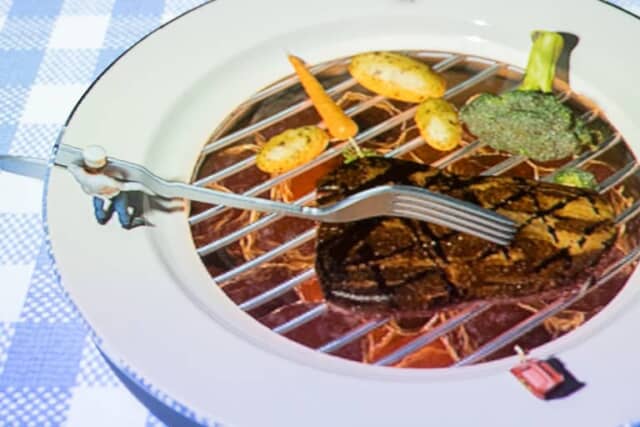 いよいよメインディッシュの肉料理です。メラメラと炎を上げるお皿には網が敷かれ、そこへプチシェフが肉や付け合わせの野菜を乗せて焼き上げます。肉を一生懸命裏返す奮闘ぶりも見どころです。